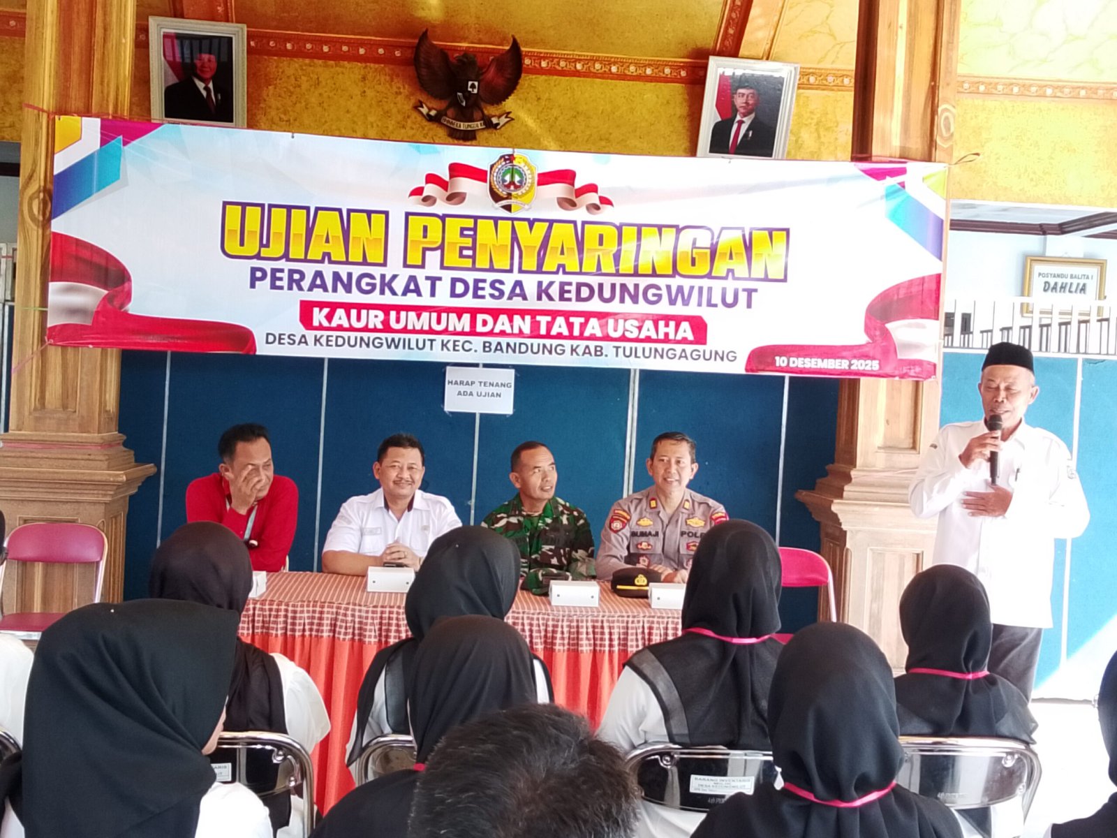 Tulungagung,Kabarnews.net – Tahap pelaksanaan ujian penyaringan perangkat Desa Kedungwilut, Kecamatan Bandung, Kabupaten Tulungagung, tengah berlangsung hari ini, Rabu, 10 Desember 2025. Kegiatan ini diselenggarakan untuk mengisi kekosongan jabatan Kepala Urusan Umum dan Tata Usaha (Kaur Umum dan TU) di lingkungan Pemerintah Desa Kedungwilut.