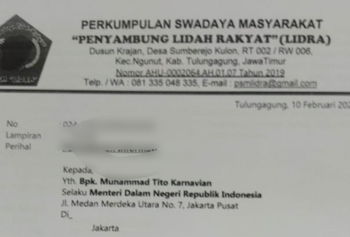 ​Upaya PSM Lidra melaporkan hal ini ke Mendagri Tito Karnavian adalah langkah konstitusional untuk menguji apakah azas-azas umum pemerintahan yang baik (General Principles of Good Administration) masih ditegakkan di Tulungagung.