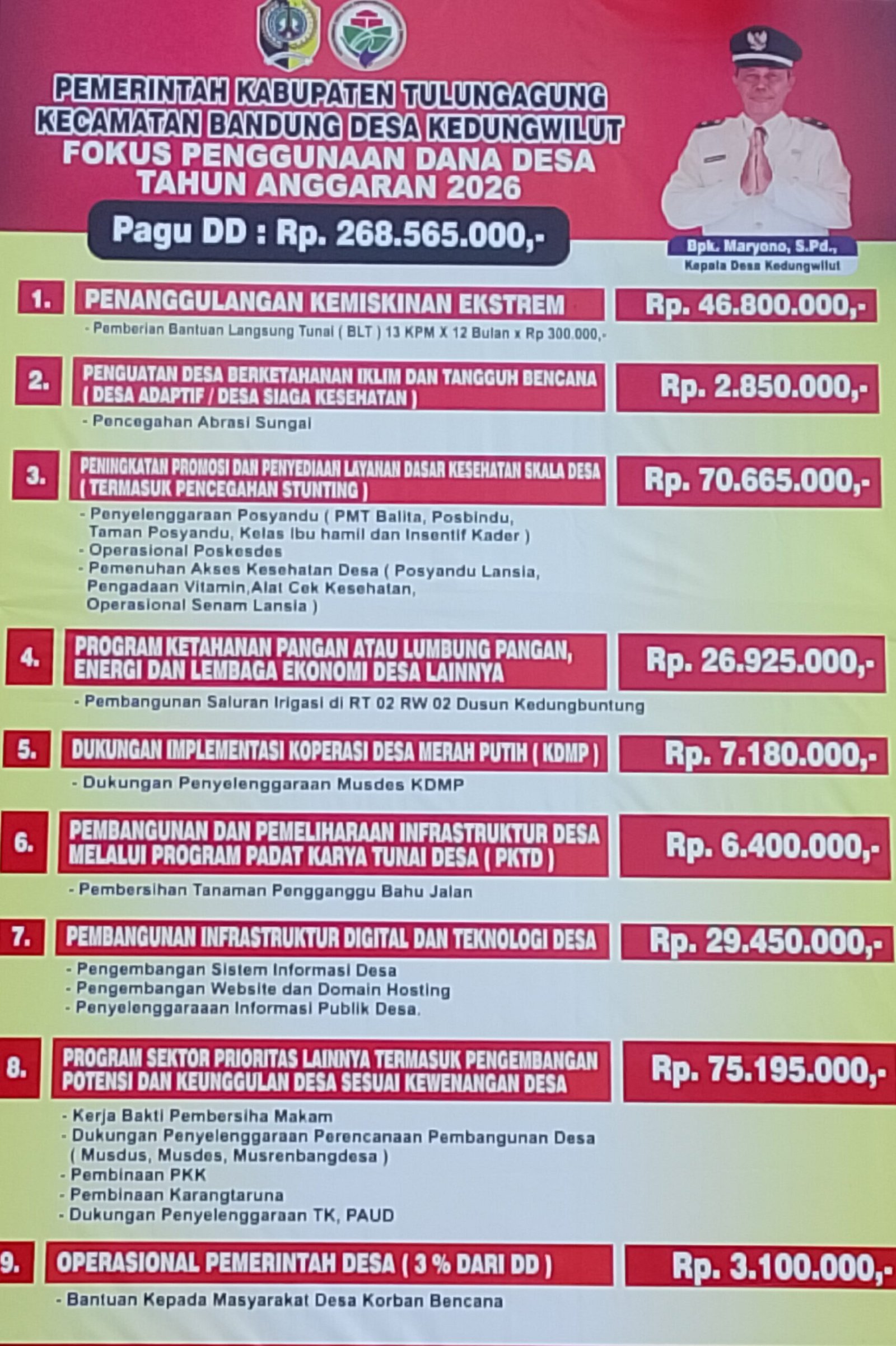 TULUNGAGUNG,Kabarnews.net– Pemerintah Desa (Pemdes) Kedungwilut, Kecamatan Bandung, secara resmi merilis rincian penggunaan Dana Desa (DD) Tahun Anggaran 2026. Dengan total pagu sebesar Rp268.565.000, desa ini menetapkan peta jalan pembangunan yang menitikberatkan pada kemandirian ekonomi dan modernisasi layanan.