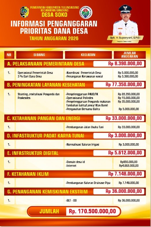 ​TULUNGAGUNG,Kabarnews.net – Pemerintah Desa (Pemdes) Soko, Kecamatan Bandung, resmi merilis rincian penggunaan Dana Desa (DD) Tahun Anggaran 2026. Dengan total pagu sebesar Rp170.500.000,00, Pemdes Soko menetapkan arah kebijakan pembangunan yang berfokus pada dua pilar utama: peningkatan kualitas kesehatan masyarakat serta penguatan ketahanan pangan desa.